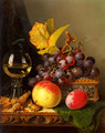 Black Grapes on a Carved Ivory Box, Peaches, Whitecurrants and Hazelnuts with a Hoch Glass on a Marble Ledge -