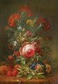 Roses, carnations, poppies and other flowers in a vase, with cherries, grapes and peaches on a wooden ledge - (after) Rachel Ruysch