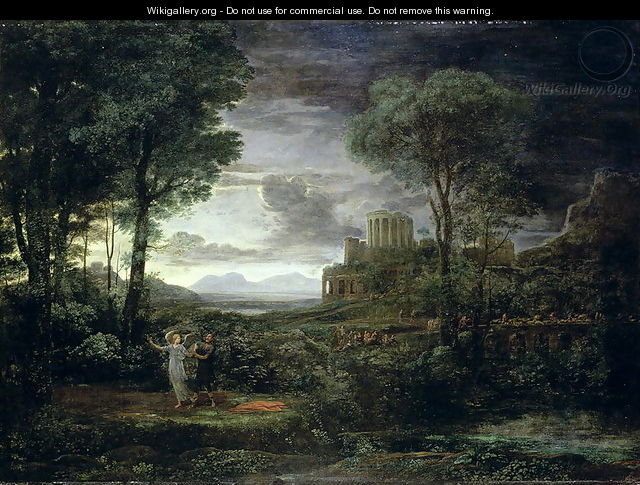 An Italianate landscape with drovers by a stream, classical ruins on a hill beyond - Dirck van der B Lisse