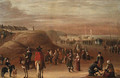 A coastal landscape with peasants and elegant figures on the shore, beached fishing boats beyond - (after) Cornelis Beelt