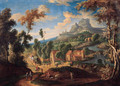 Peasants and travellers on a road by a village in a mountainous landscape - (after) Matthys Schoevaerdts