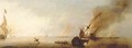 A calm with sailors being rescued from a sinking ship, a burning man-o'-war beyond - Peter Monamy