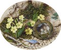 Primroses, a crocus and a bird's nest, on a mossy bank - John Sherrin